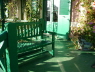 Die Veranda, die Fensterläden sowie die Rankhilfen aus Metall, an denen Kletterrosen, Clematis, wie auch Blauregen emporklettern, sind in dem markanten Grün gestrichen. Diese Bogen verleihen dem Garten mehr Raum und erinnern an ein verwunschenes Labyrinth.