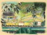 Teile des Hauses, des Wassergartens wie auch die Sicht auf das gesamte Anwesen sind zu sehen. Das Band hat die Farbe, die auch auf dem gesamten Grundstück zu sehen ist. In der Plakette ist das Markenzeichen des Souvenir-Shops wiederzuerkennen.